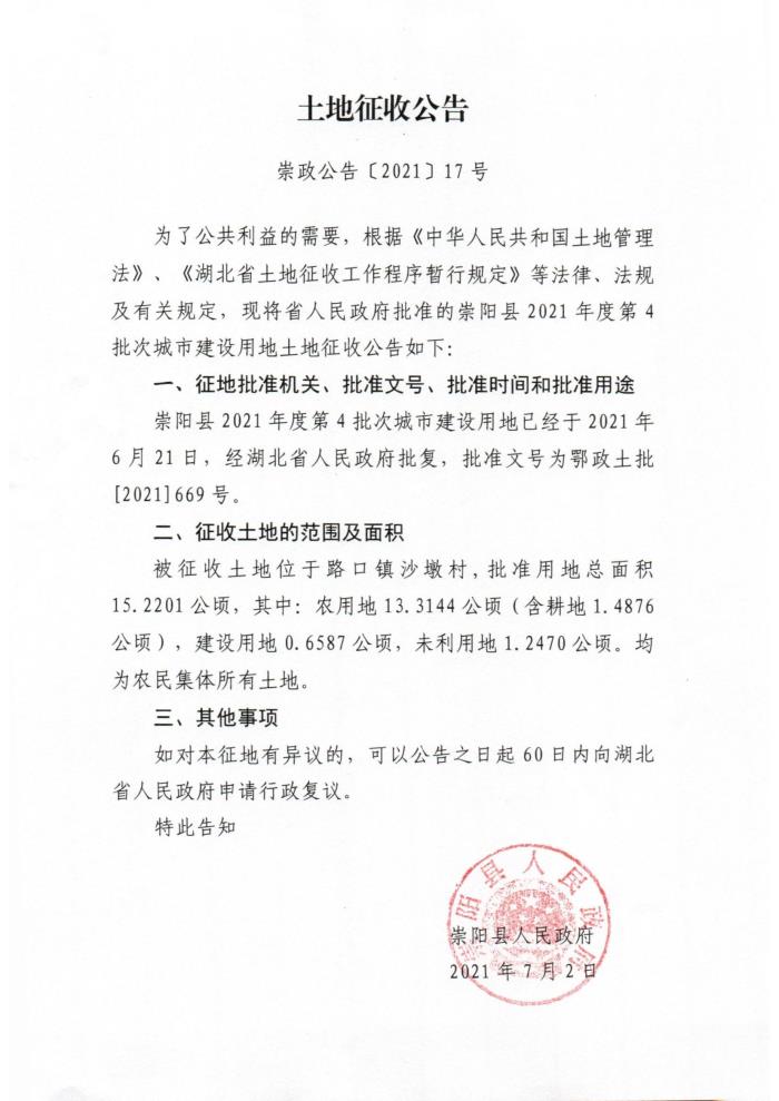 崇阳县人民政府土地征收公告(崇政公告﹝2021﹞17号) :