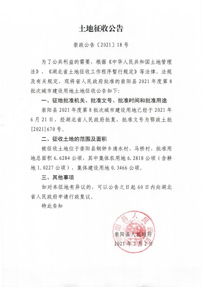 崇阳县人民政府土地征收公告(崇政公告﹝2021﹞18号) :