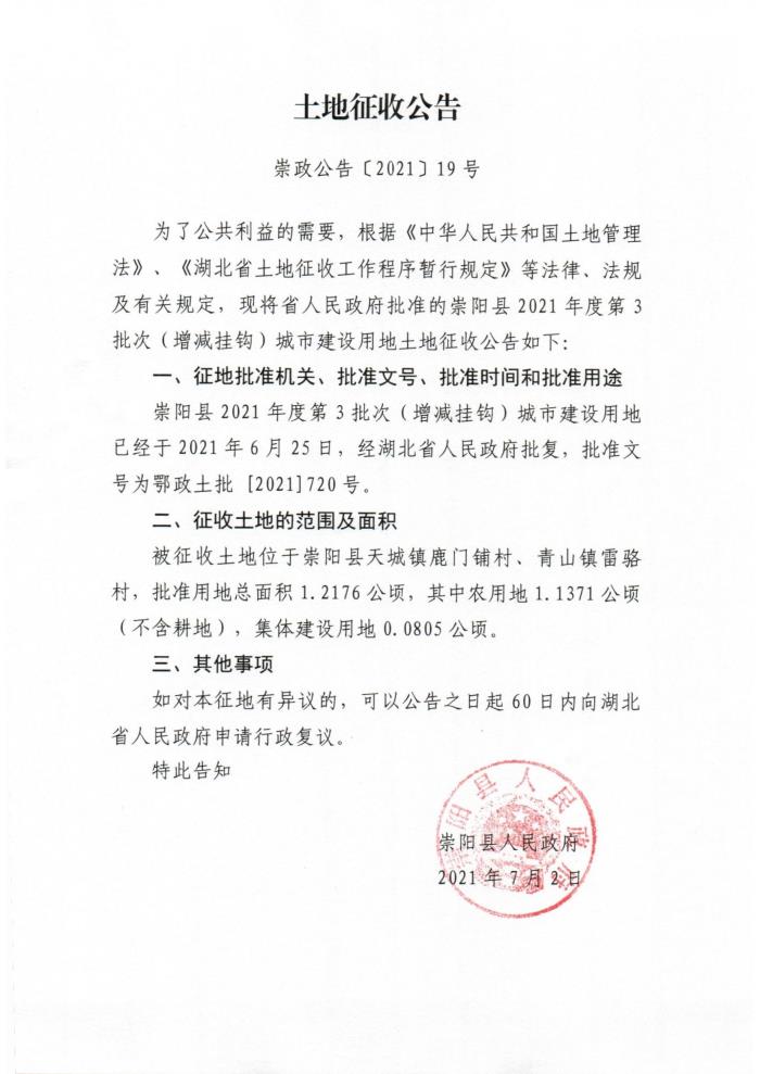崇阳县人民政府土地征收公告(崇政公告﹝2021﹞19号) :