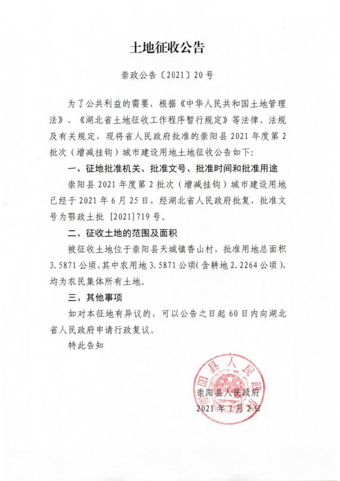 崇阳县人民政府土地征收公告(崇政公告﹝2021﹞20号) :