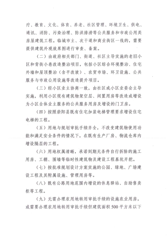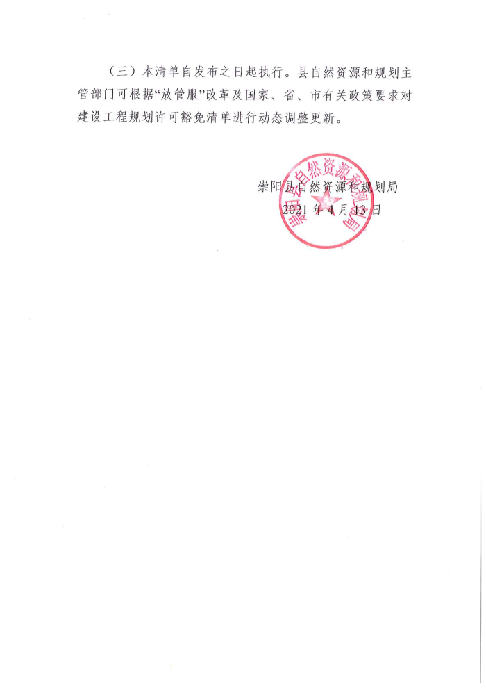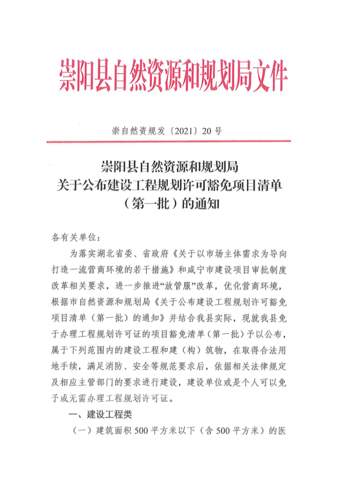 崇阳县自然资源和规划局关于公布建设工程规划许可豁免项目清单(第一批)的通知